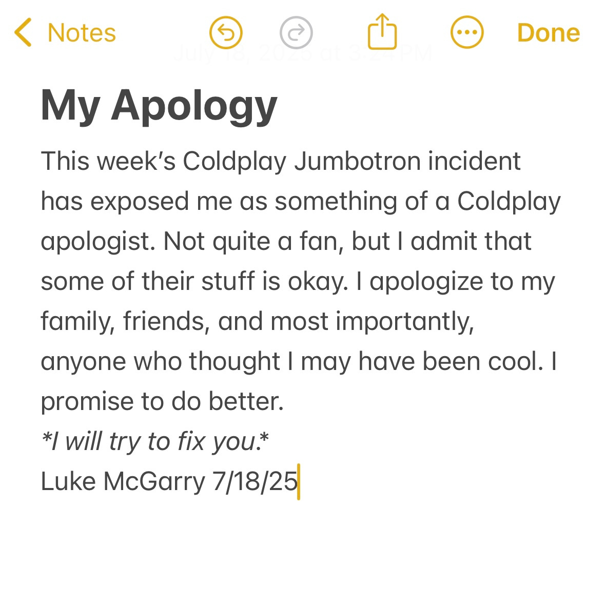 Coldplay get a bum rap! I think the first three albums are good! As evidenced by the big news story this week, they bring people together! Chris Martin seems alright! I was gonna cite one song to listen to off Parachutes, but you could pick any of them (other than “Yellow”) and it would prove my point; they are okay. Do yourself a favor and put that first album on for a bit. Revisit it!