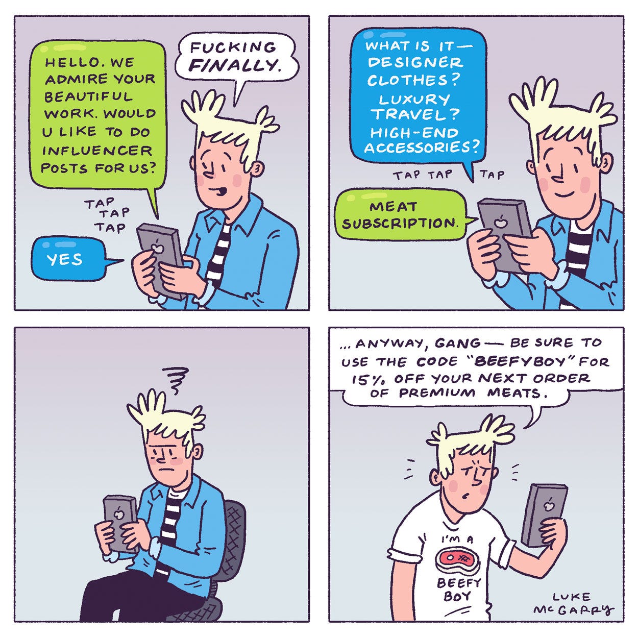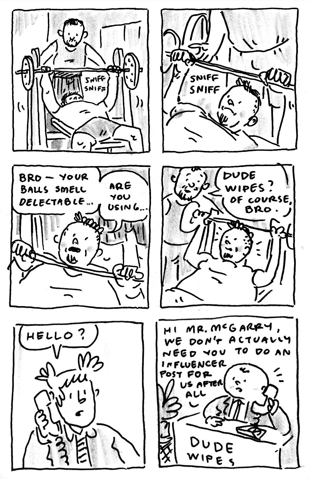 I have 100k followers on Instagram so every so often I get approached about an influencer campaign, but nothing good ever. One time it was fancy knives, another time; a meat subscription service. Today it was a Dude Wipes knock off. I think dude wipes are… a wet wipe for your balls? I didn’t take the job but I’ve gone ahead and done a cartoon.